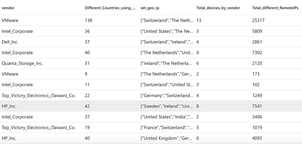 | summarize Different_Countries_using_Manufacter_Device= dcount(geo_ip), make_set(geo_ip),Total_devices_by_vendor=dcount(Source_Mac),Total_different_RemoteIPs=dcount(RemoteIP),make_set(RemoteIP) by vendor
