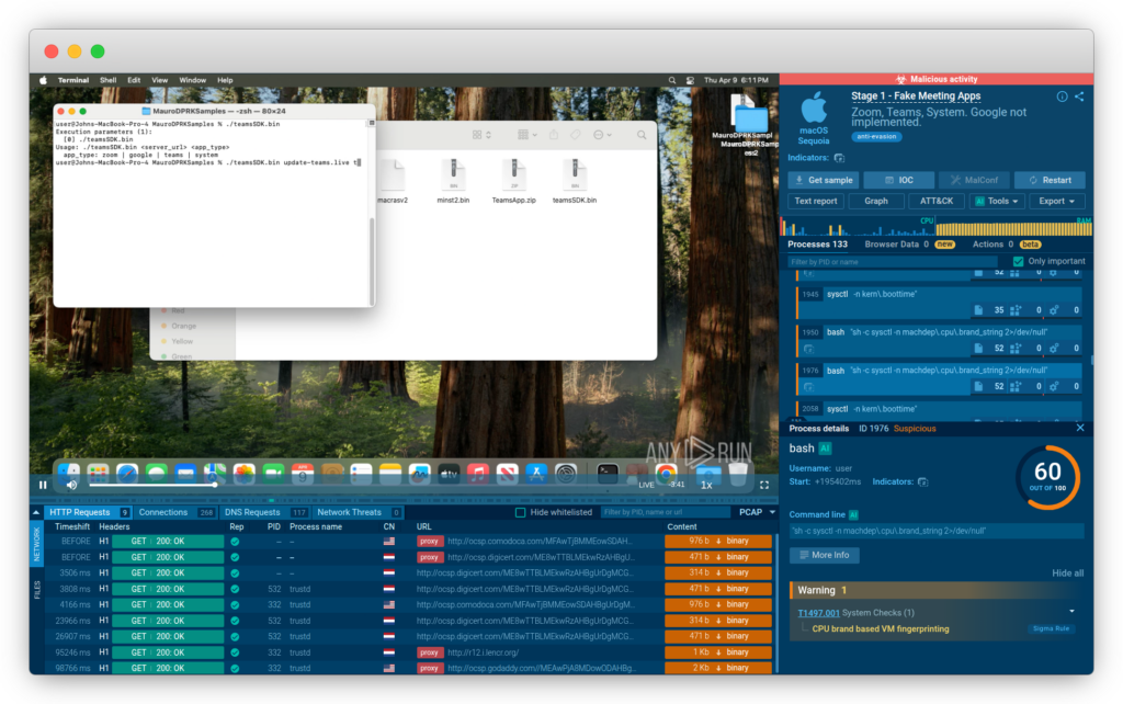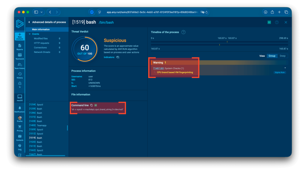ANY.RUN’s sandbox delivers fast verdicts on malicious files and URLsInstead of juggling separate solutions for each OS, SOC teams gain a unified sandbox environment where they can manually simulate user interactions, uncover hidden attack stages, and capture behavioral IOCs, such as unusual sysctl queries in macOS or Mach-O binary execution.
