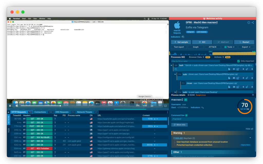 Self-deletion routine With this, the full infection cycle is complete. Thanks to ANY.RUN’s macOS analysis capabilities, we were able to fully reconstruct it in record time. It is worth noting that this is a novel (previously unseen) malware, which would typically require significantly more time to disassemble and analyze using traditional methods.